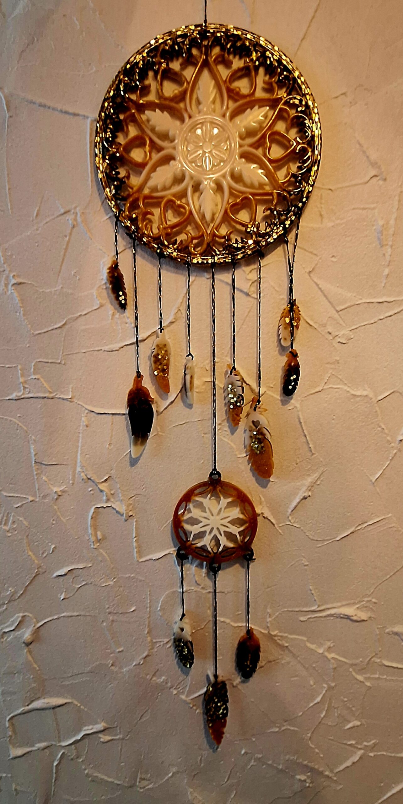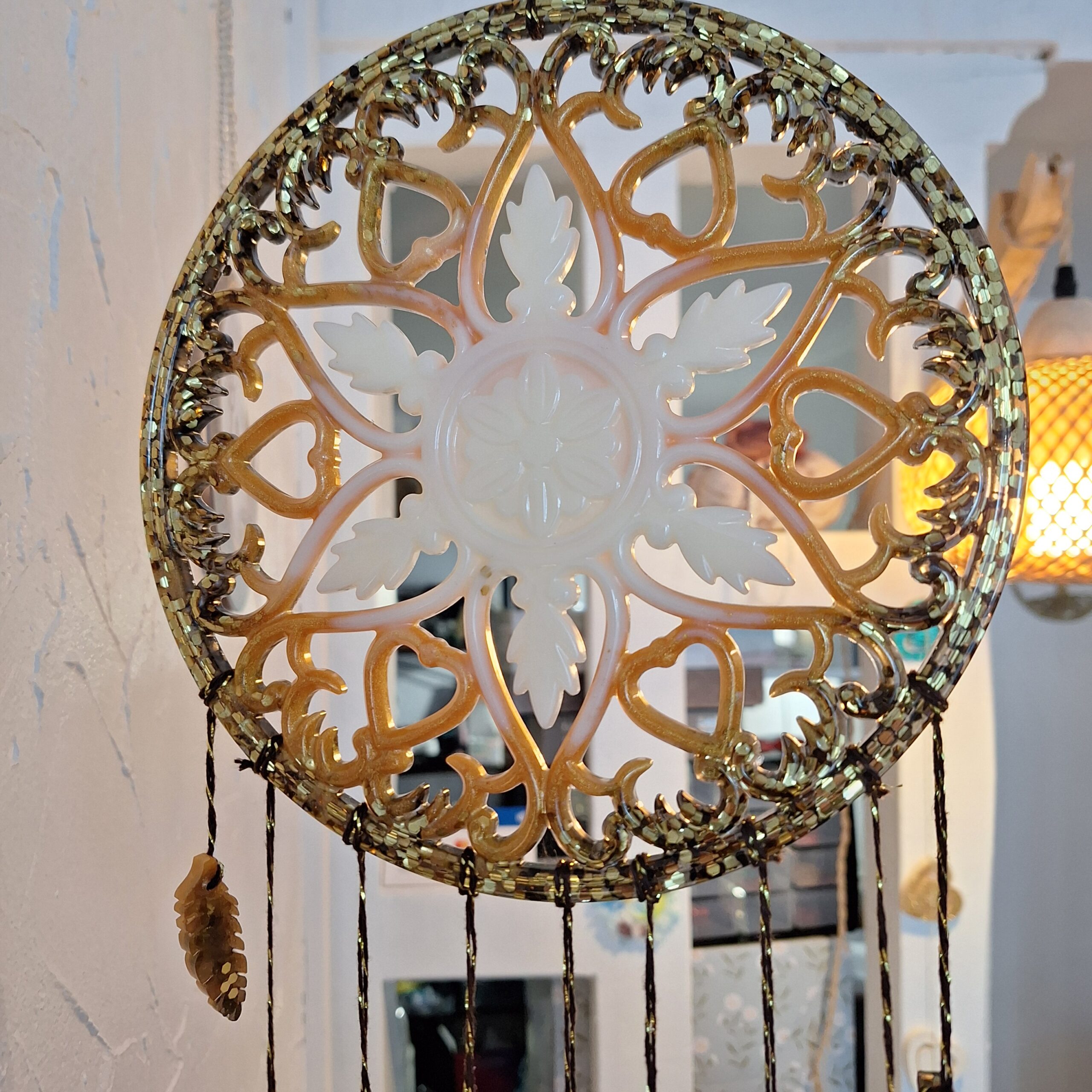 Ce magnifique attrape-rêve est réalisé artisanalement en résine époxy. C’est un modèle unique d’un diamètre de 20 cm. Placez votre attrape-rêve au-dessus du lit fixé au mur ou accroché au plafond pour inviter des nuits sereines . Vous crérez ainsi une atmosphère propice à la détente.