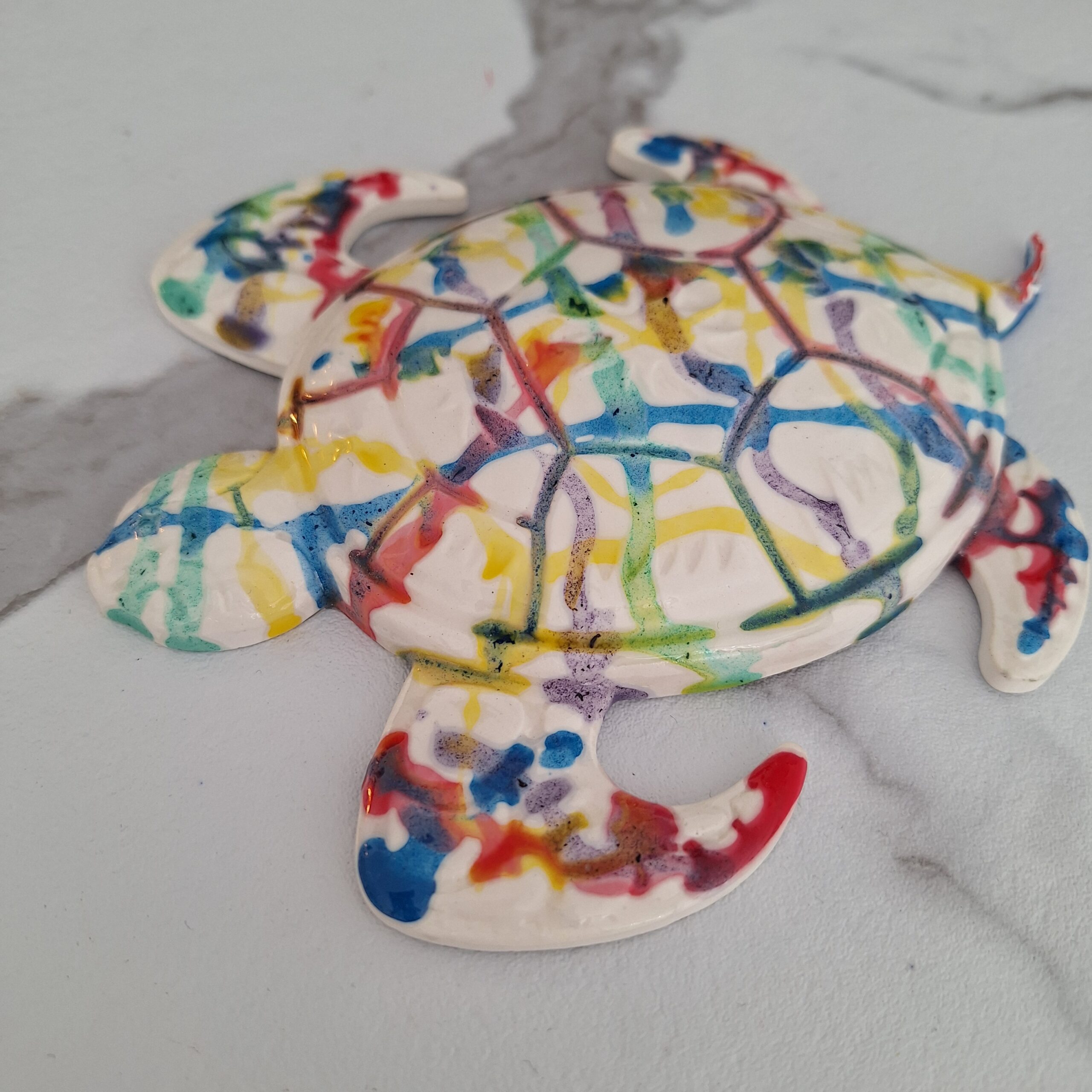 Pour entretenir votre tortue décorative, nettoyez-la avec un chiffon doux et du savon. Évitez les produits abrasifs et l’exposition prolongée au soleil pour conserver toutes ses belles couleurs.